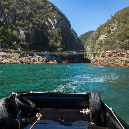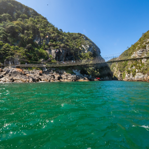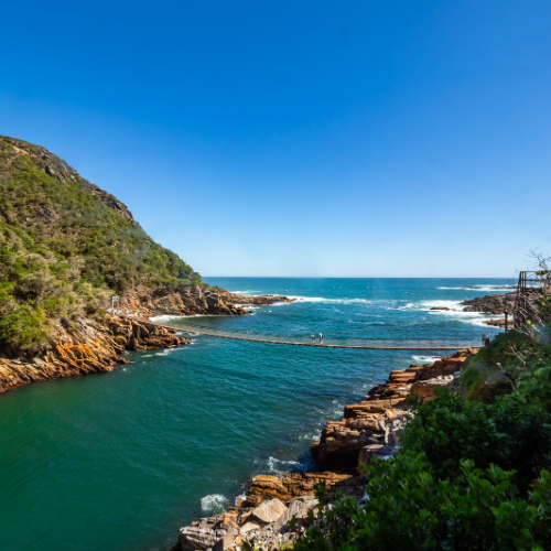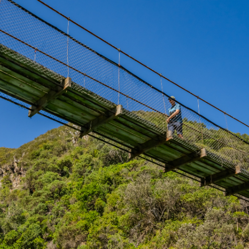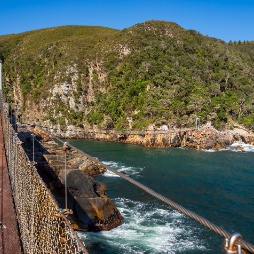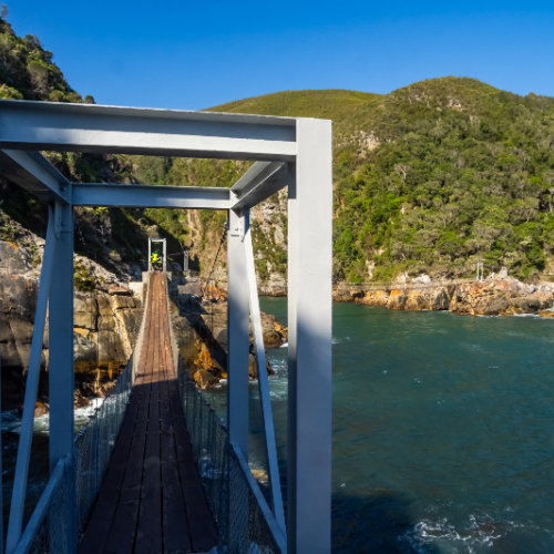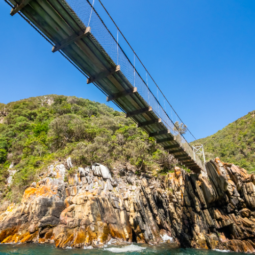 The suspension bridges at Storms River Mouth are a central feature of the Tsitsikamma Section of the Garden Route National Park in the Eastern Cape, South Africa. This iconic attraction offers visitors an exhilarating experience and breathtaking views of the dramatic coastline where the Storms River meets the Indian Ocean.