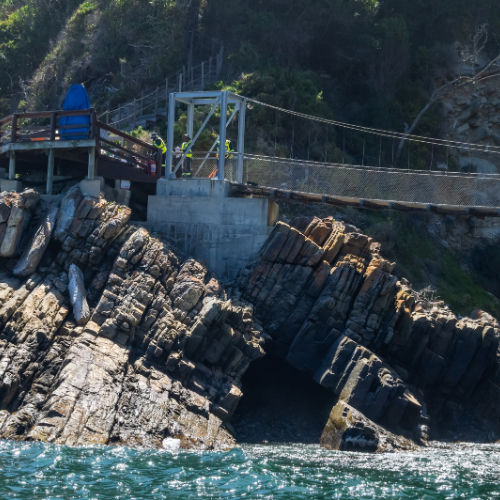 Since the works are being carried out over the Storms River, strict measures were implemented to prevent any debris from falling into the river and contaminating the water. To minimize environmental impact, only existing walkways, jetties, and stone beaches were used for mooring the barge.